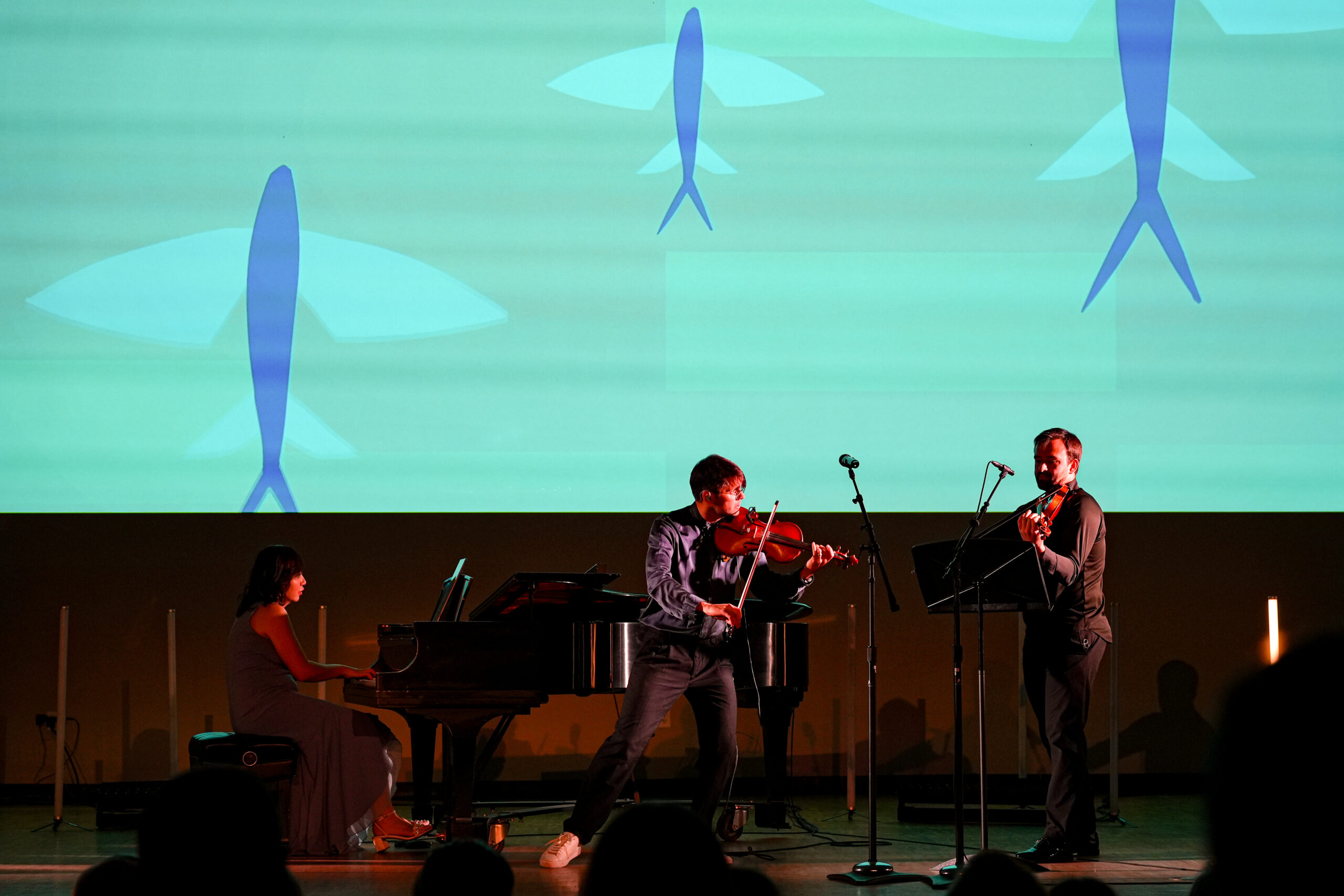 The show ended with Sea Fairies, the piece Chad had been working on since his visit to the Great Salt Lake. Amazingly Tim had managed to create really cool animation in just two days. In addition to being visually stunning, it showed the life cycle of the brine shrimp and flashed to real videos of their fairy-like forms. I don’t know how Hui and Kehoe learned the piece so fast, but they were both incredible.