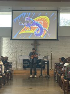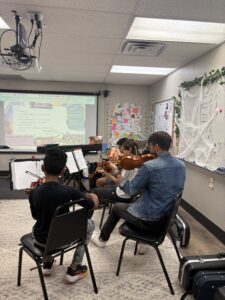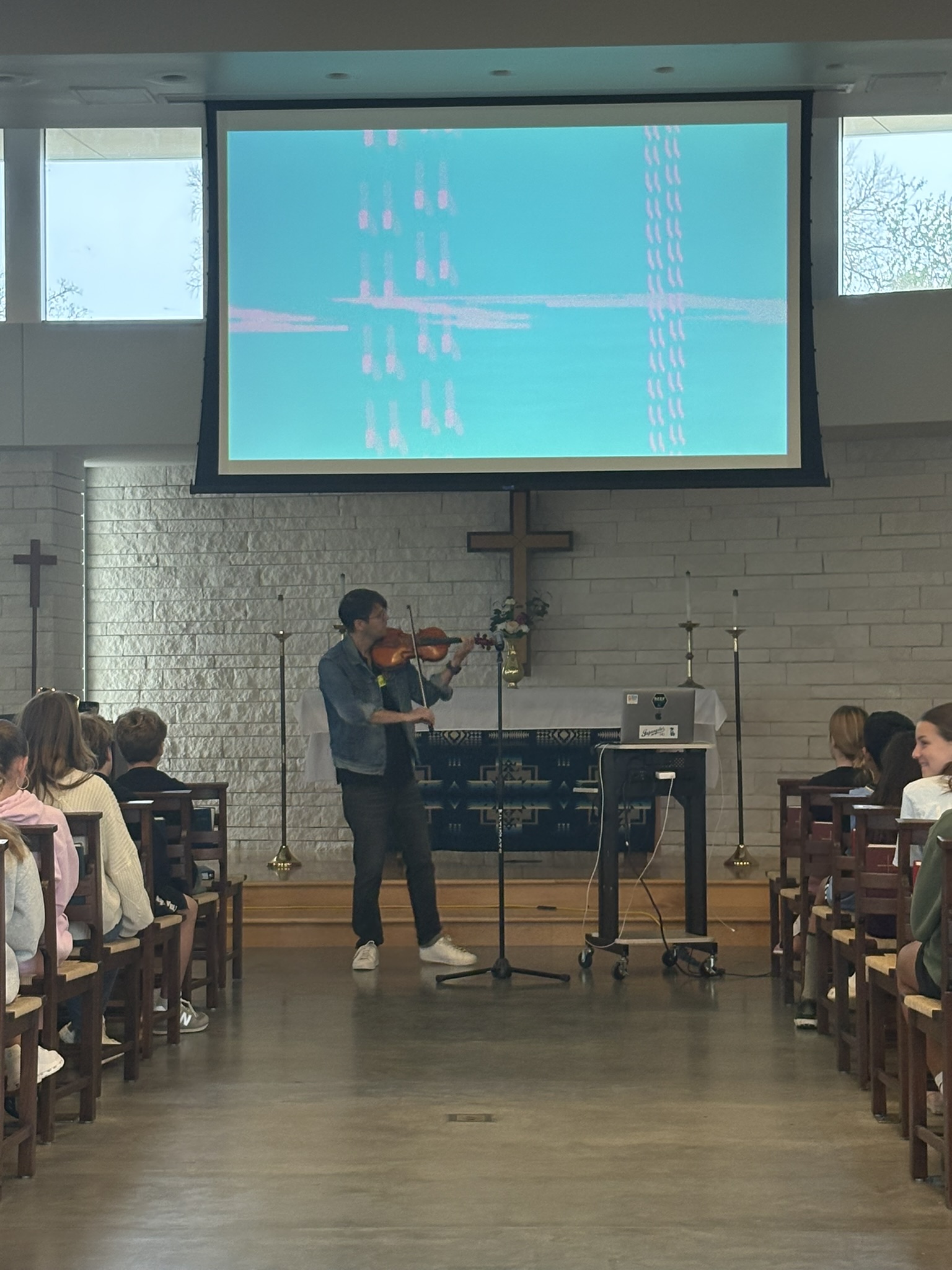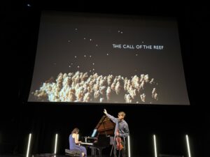 Riding the wave from the night before, Chad, Antal, and I were up early in the morning to visit Saint Andrew’s School, where in addition to Chad and my science/song mashup, Antal spoke emotionally to the students about why he does the work he does to protect the coral. Once again, it was so much fun to watch the students shake the sleep from their bodies as Chad played his gorgeous music. On the way out the door, we stopped by the string class, and Chad sat in with the students on a rendition of The First Noel, it being just a few weeks before Christmas.