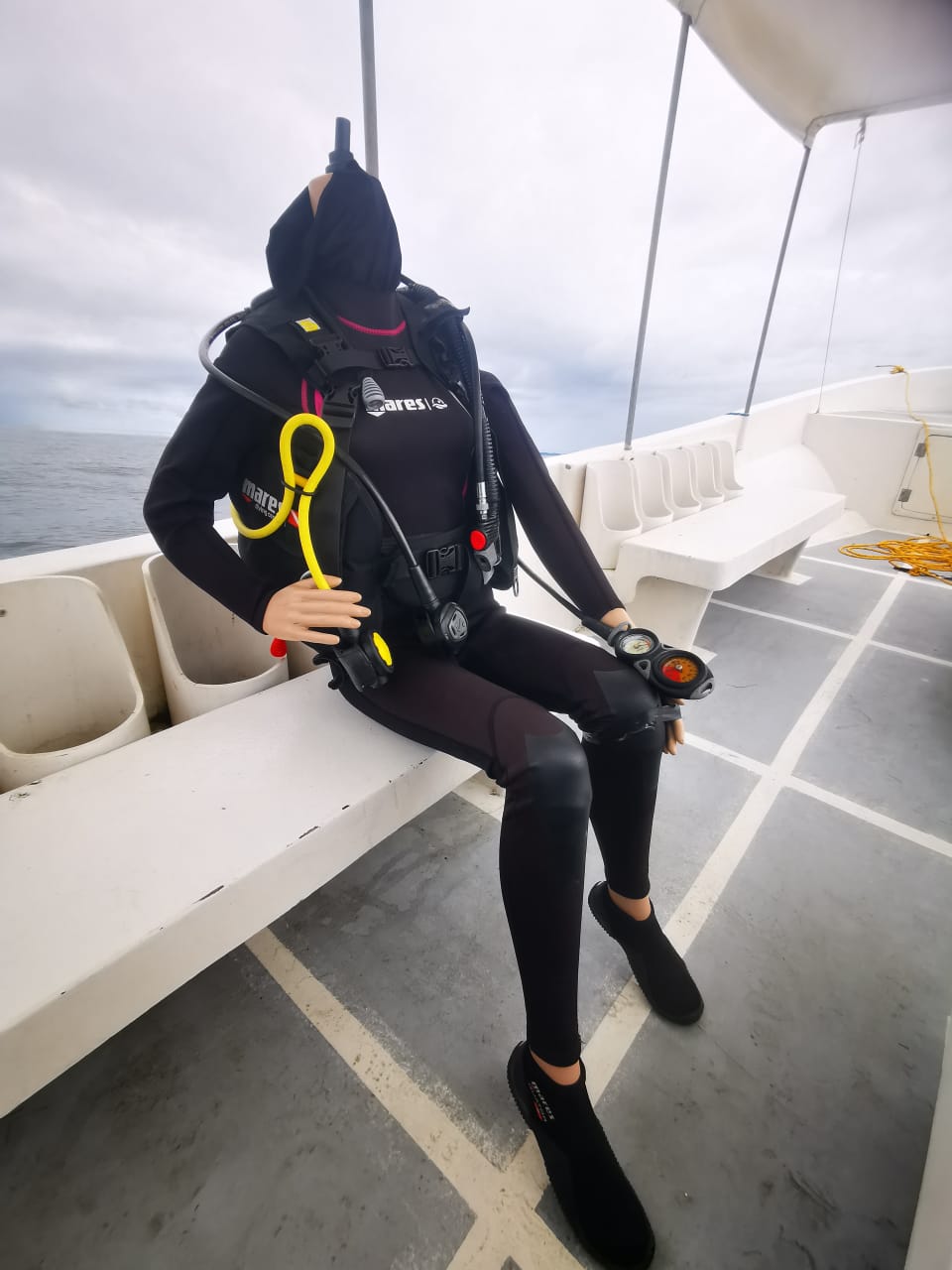 Enter Melody – the world’s first VR-headed diver! Antal and his team at the dive shop borrowed a mannequin from a local dress shop. (Antal says the team named her.) They geared it up in a wetsuit, buoyancy vest, dive console and regulator, even booties! Instead of head, Melody has the 360-degree camera, capturing scenes that aren’t just floating in space, but actually connected to a diver’s body. We think Melody is genius!